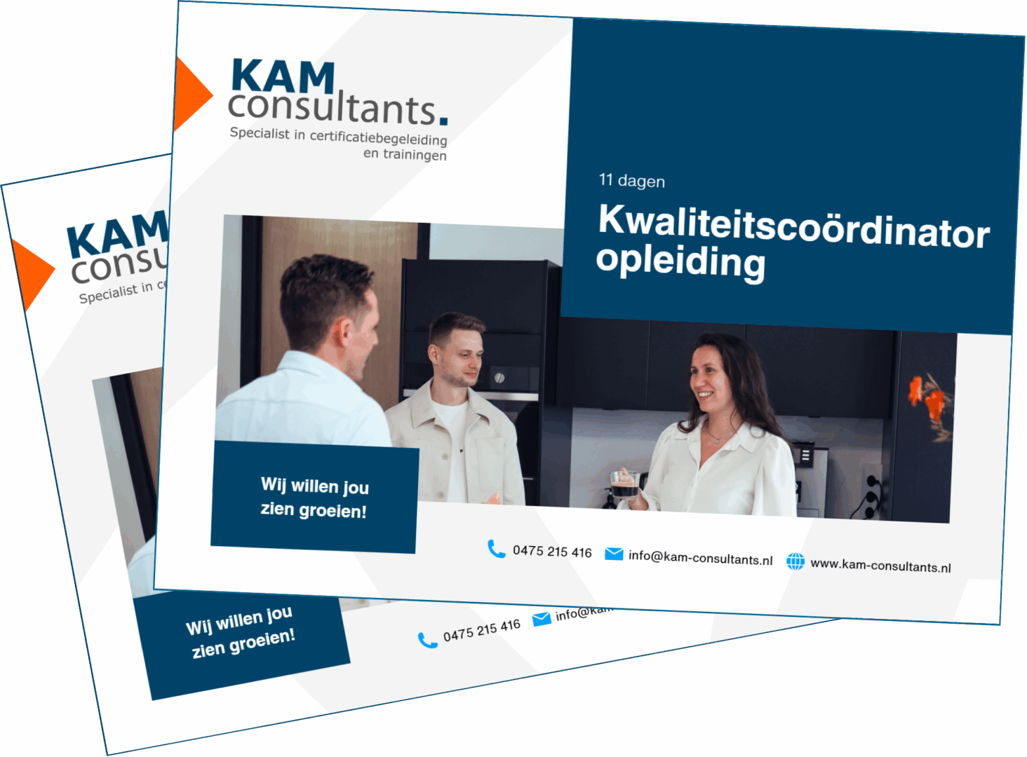 Onze trainers zijn experts met ervaring in het werkveld: zij leren jou alle kneepjes van het vak op het gebied van Kwaliteit, Arbo en Milieu. Je vindt ze op de Over Ons pagina van onze website, ze zijn vermomd als Certificatiespecialist. Naast het geven van trainingen en opleidingen, staan ze met hun voeten in de KAM-klei. We leggen de theorie op een praktische, toepasbare en toegankelijke manier uit, zodat je het geleerde direct in de praktijk kunt brengen. De opleiding volg je in een kleine groep, hierdoor hebben de trainers tijd en ruimte voor persoonlijke aandacht.